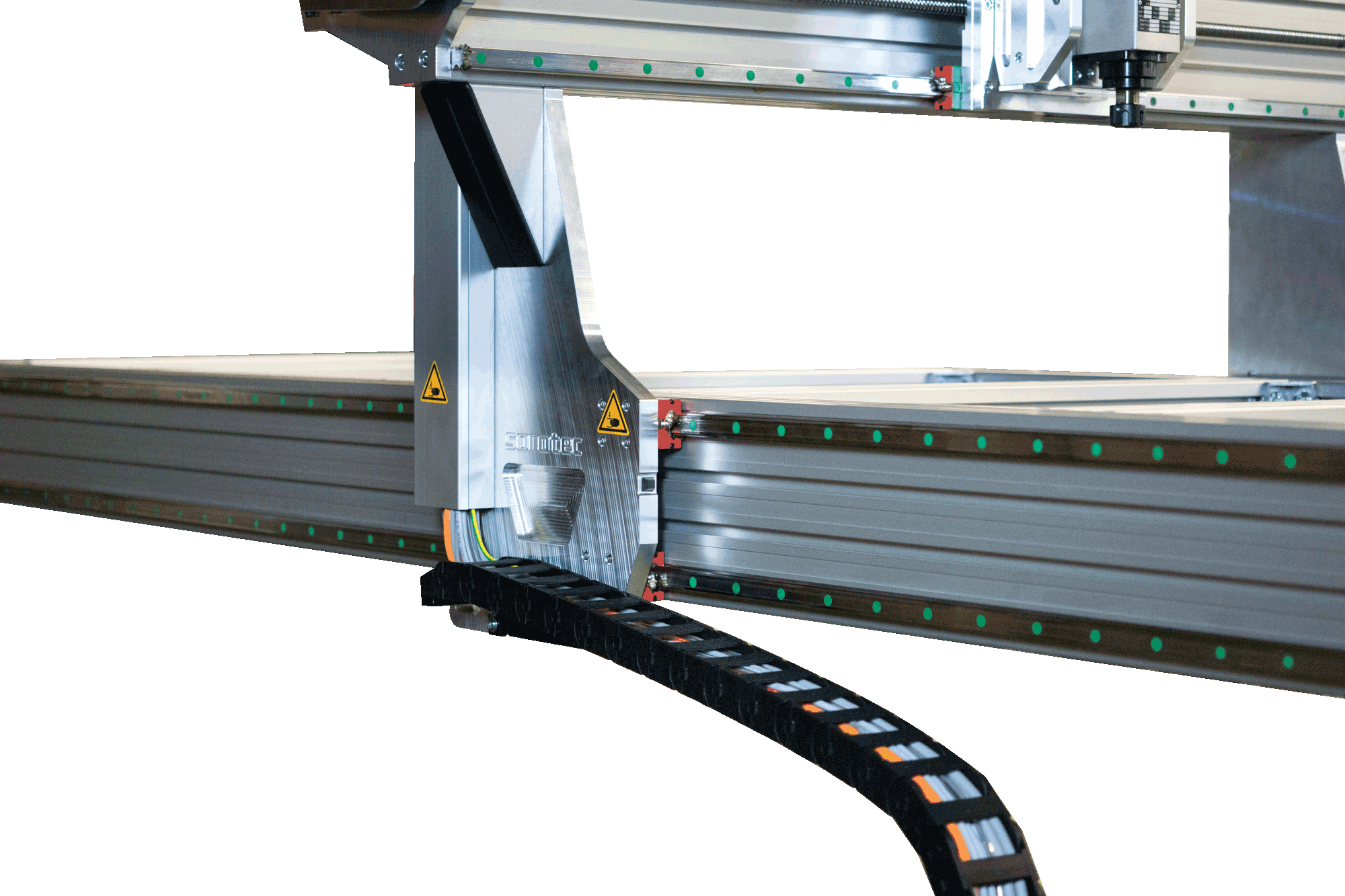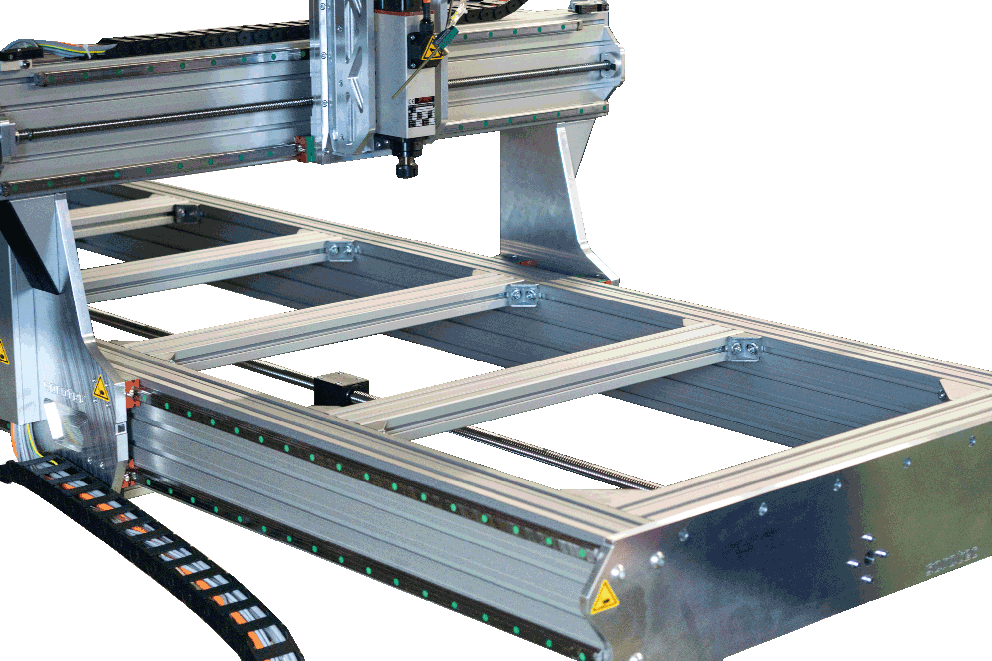 Zusätzlich werden auf der langen Achse vier Linearführungsschienen (je zwei pro Seite) montiert. Dadurch wird die Portalstabilität deutlich erhöht und Verwindungen werden effektiv reduziert.